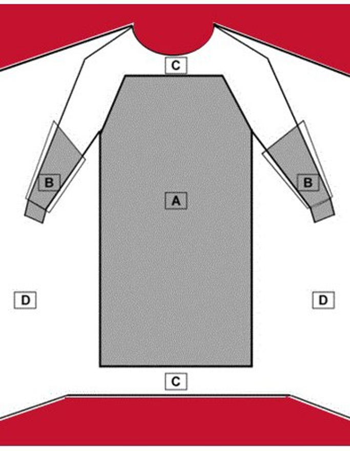 Critical Zones are defined as the areas where direct contact with blood, bodily fluids, and other potentially infectious material is most likely to happen (Areas A and B). For surgical gowns, this includes the fabric and the construction (sleeve seams, front tie attachment) in areas A and B. The entire gown (Areas A, B, and C), including seams but excluding cuff, hems, and bindings, is required to have a barrier performance of at least Level 1. The back of the surgical gown (Area D) may be non- protective. AAMI liquid barrier standards also apply to surgical drapes.